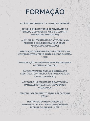 Atuação nas áreas do direito criminal, direito das famílias, do consumidor e direito trabalhista. Pós graduado em direito penal e processual penal. Mestrando em Meio Ambiente e Desenvolvimento - UFPR.